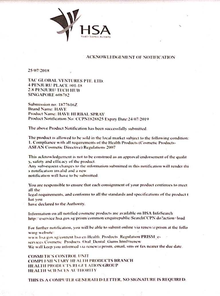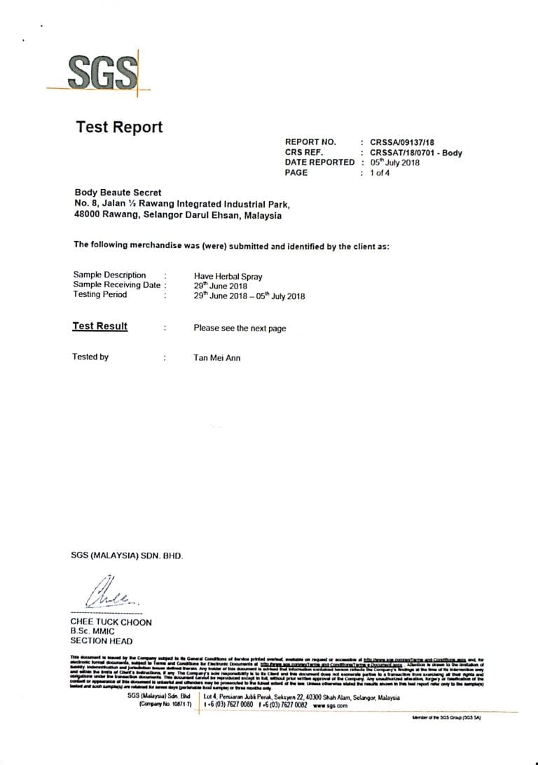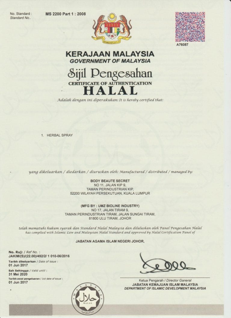 Produk ni tak bahaya. Semua bahan-bahan yang digunakan adalah selamat untuk digunakan dan mematuhi piawaian dan peraturan kebangsaan melalui pensijilan dari Standard Global Services (SGS Malaysia) dengan no rujukan: CRSSAT/18/0701.